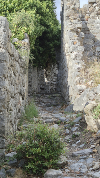 Der Eintritt in die Ruinen kostet ein paar Euro (aktuell etwa 2 €), aber das ist es absolut wert. Es ist schon ein besonderes Gefühl, durch die alten Gemäuer zu laufen – zwischen bröckelnden Mauern, Bögen und alten Türmen fühlt man sich fast ein bisschen in der Zeit zurückversetzt. Immer wieder öffnen sich fantastische Ausblicke auf die umliegenden Berge, Olivenhaine und bis runter zur Küste.