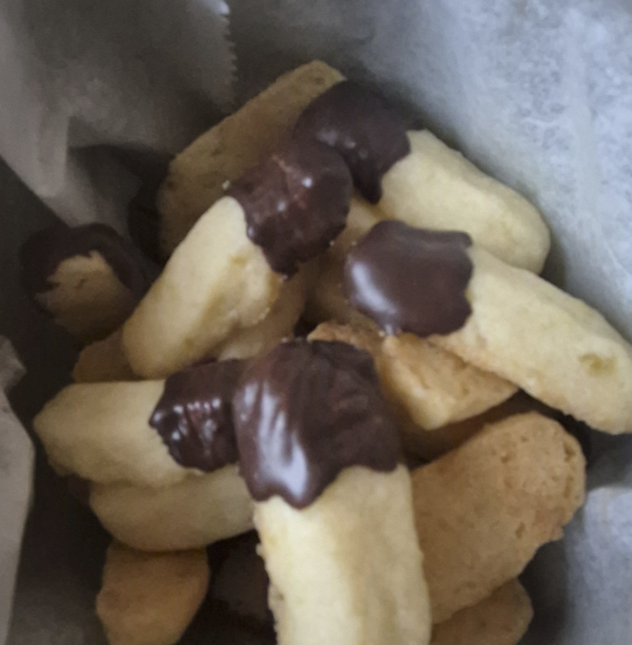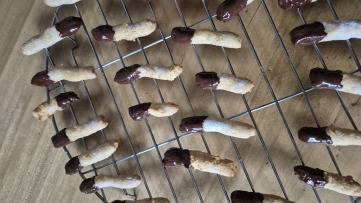 Alles gut miteinander vermengen, zu langen Rollen formen und etwa 5 cm lange Stangen abschneiden. Bei 180 °C ca. 12 Minuten backen, bis sie leicht goldbraun sind. Nach dem Abkühlen die Enden mit Kuvertüre verzieren – oder nur eine Seite, das ist praktischer zum Anfassen.