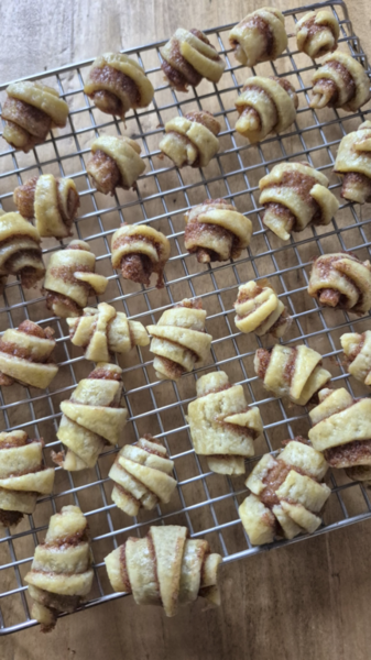 In 16 Stücke schneiden, von der breiten Seite aufrollen.