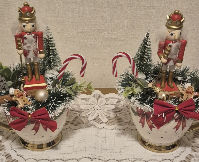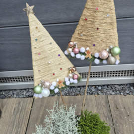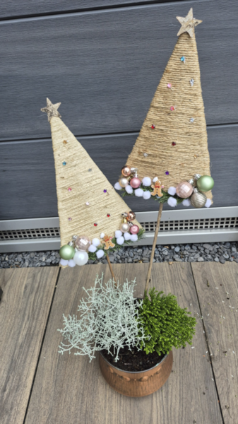 Aus alten Kartonresten habe ich Dreiecke ausgeschnitten und sie mit Kordel beklebt. Unten wurden sie noch ein bisschen mit Weihnachtskugeln und anderen Details verziert – und schon ist die perfekte Deko für die Blumentöpfe draußen fertig!