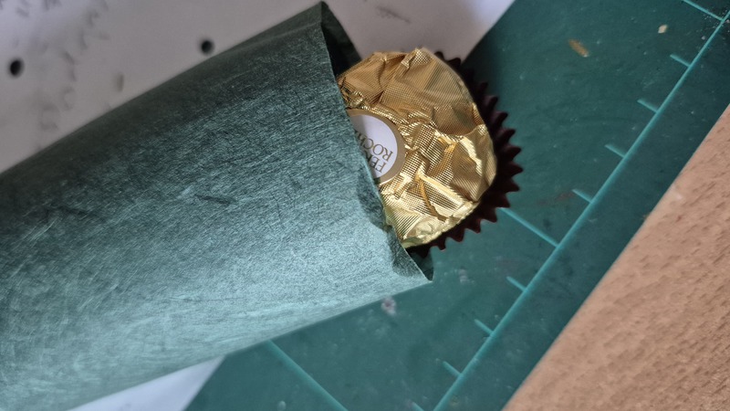 Ich habe leere Toilettenpapierrollen mit Rocher gefüllt, sie in Seidenpapier eingewickelt und wie ein Bonbon verpackt. Die beiden Enden habe ich jeweils mit einem Band zusammengebunden.