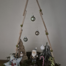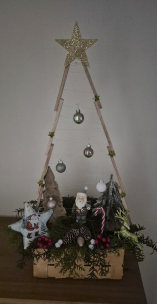Aus den Holzklötzchen habe ich mir noch einen kleinen Tannenbaum gebastelt, ihn auf einen Korb geklebt und hübsch verziert. Damit ist die Deko für unsere Haustür jetzt komplett