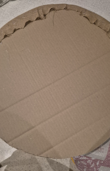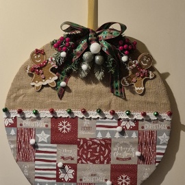 Jetzt, kurz vor Weihnachten, haben wir ja alle meist sehr viele Kartons zu Hause. Ich hatte Glück, denn einer davon war besonders groß. Daraus habe ich mir einen Kreis ausgeschnitten und ihn mit weihnachtlichen Stoffen beklebt, die ich noch zu Hause hatte. Anschließend habe ich alles mit weihnachtlicher Deko dekoriert, die man so zu Hause hat.