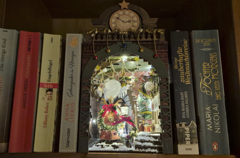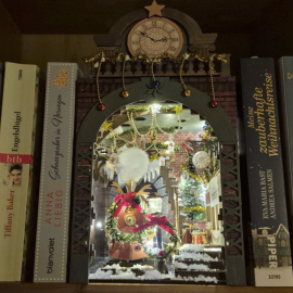 Ich habe es tatsächlich noch geschafft, mein Book Nook mit dem Weihnachtsexpress rechtzeitig vor Weihnachten fertigzustellen. Jetzt sieht es einfach großartig im Bücherregal aus – auch wenn dafür ein paar Bücher aus dem Regal weichen mussten.
