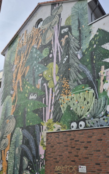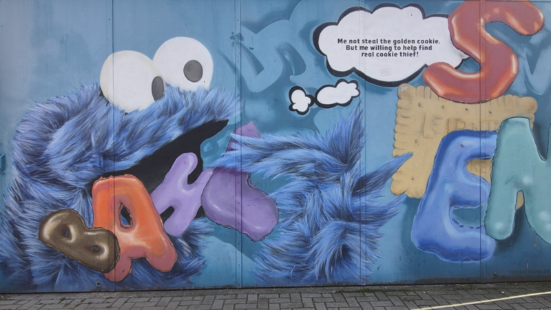 Bei der Suche nach den Graffitis stolpert man ganz nebenbei auch über das Krümelmonster am Hoftor der Firma Bahlsen – ziemlich witzig!