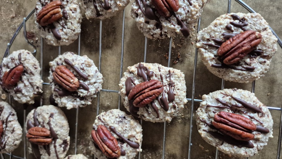 Nach dem Abkühlen mit Schokoglasur verzieren und jeweils eine ganze Pekannuss daraufsetzen.