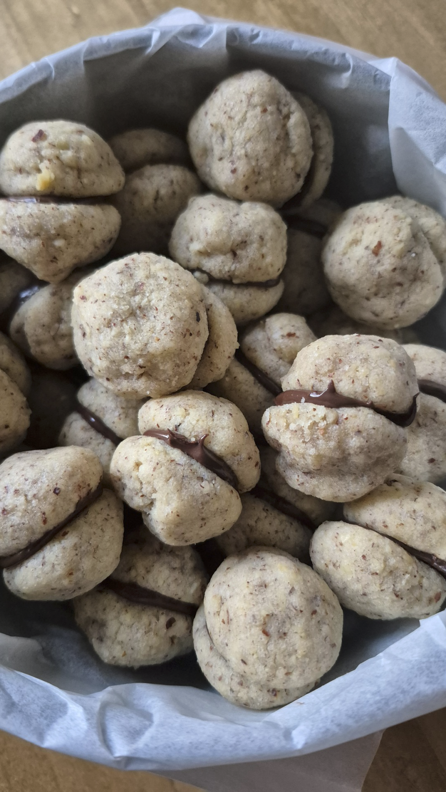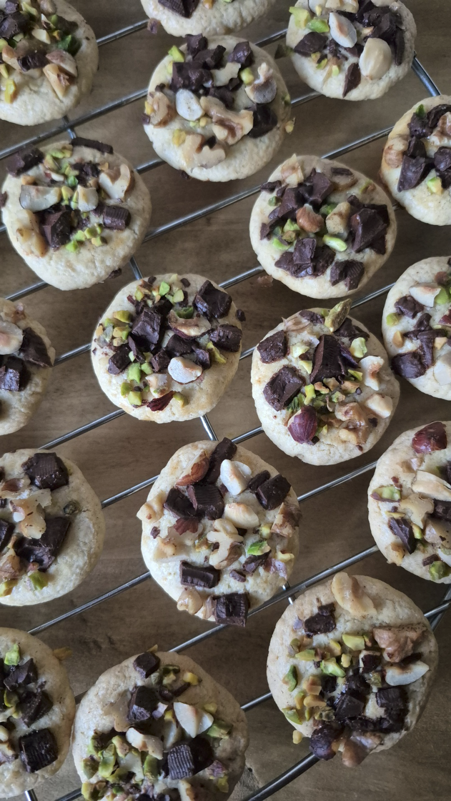 Die Plätzchen werden mit Eiweiß bestrichen und mit etwas von der Schoko-Nuss-Mischung bestreut, die du leicht andrückst. Anschließend kommen sie bei 175 °C Umluft für etwa 12–15 Minuten in den Ofen.