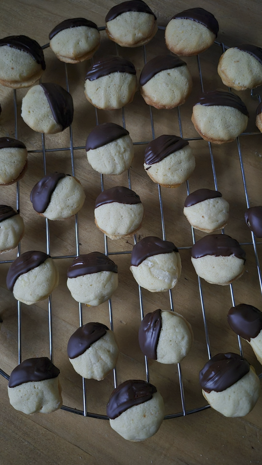 Zum Schluss die Hälfte der Oberseite jedes Plätzchens mit Zartbitter-Kuvertüre bestreichen.