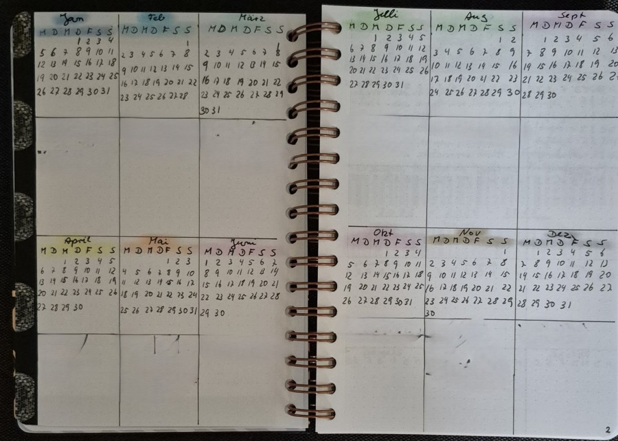 Jetzt ist erst mal ein bisschen Schreibarbeit angesagt. Die erste Doppelseite ist wie immer ein Übersichtskalender. Ich mag das total, denn so muss ich nicht jedes Mal einen extra Kalender holen, wenn ich etwas im Buch eintrage – ich habe ihn einfach immer dabei. In die unteren Kästen kommen dann feste Termine wie Geburtstage, Arzttermine usw.