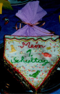 Natürlich gab es auch einen Schultütenkuchen. Dafür habe ich einen Rührteig auf einem Backblech gebacken, ihn anschließend in Form einer Schultüte zugeschnitten und mit Zuckerguss sowie einer Schrift verziert.