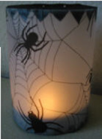 Dafür benötigt ihr leere Käseschachteln und Transparentpapier mit Halloweenmotiven. Die Kinder kleben einfach einen vorbereiteten Papierstreifen um die Schachtel. Anschließend wird ein Drahtbügel
