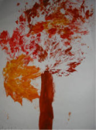 Eine schöne Idee für ein gemeinsames Bild: Malt einen Baum auf ein Blatt Papier – entweder jeder für sich oder zusammen einen großen. Dann bemalt ihr verschiedene Blätter mit Wasser- oder Fingerfarben und druckt sie als Blätter auf den Baum.
