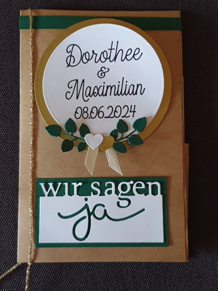 Ein paar besondere Gutscheinkarten waren gewünscht, die nicht nur praktisch sind, sondern auch liebevoll und individuell gestaltet wurden. Jede Karte wurde mit viel Kreativität und Sorgfalt gefertigt, sodass sie ein persönliches Geschenk darstellen und dem Brautpaar Freude bereiten.