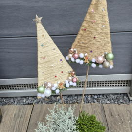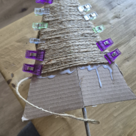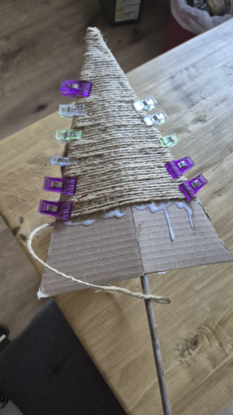 Aus alten Kartonresten habe ich Dreiecke ausgeschnitten und sie mit Kordel beklebt. Unten wurden sie noch ein bisschen mit Weihnachtskugeln und anderen Details verziert
