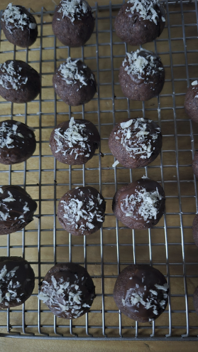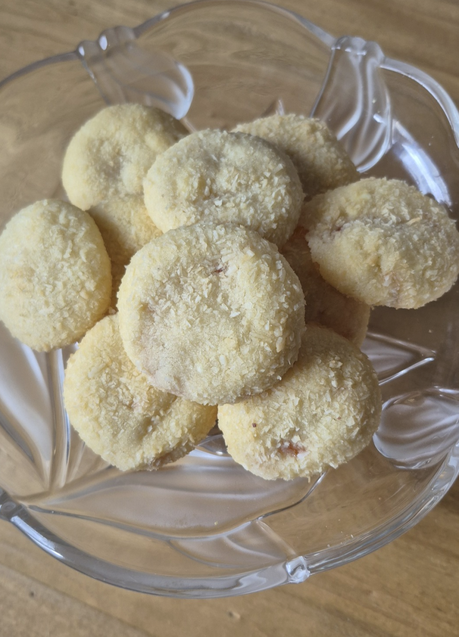 Aus dem Teig walnussgroße Kugeln formen, eine kleine Delle hineindrücken, eine Messerspitze Feigenkonfitüre hineingeben und die Kugel wieder verschließen. Die Kugeln in den Kokosraspeln wälzen und bei 180 °C etwa 12 Minuten backen. Das Rezept ist aus der Zeitung Adventsbacken.