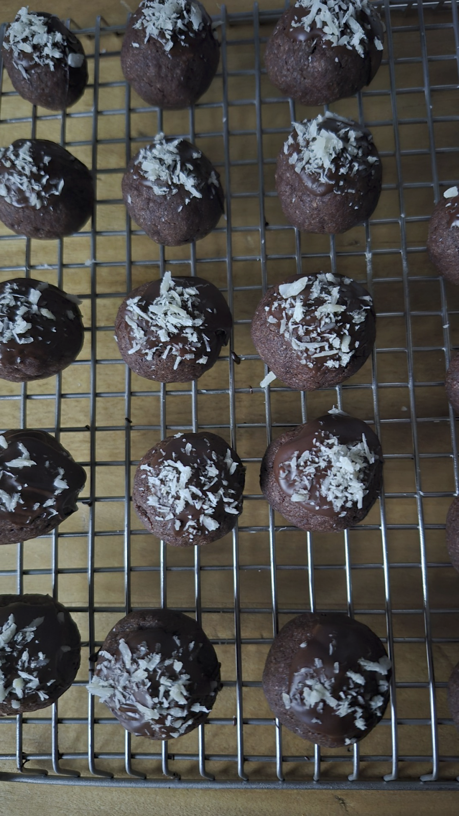 Bei 180 °C etwa 20 Minuten backen. Anschließend nach Belieben mit Kuvertüre verzieren und mit Kokosraspeln bestreuen
