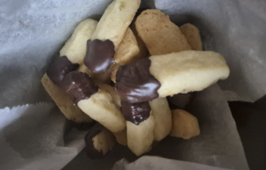 Alles gut miteinander vermengen, zu langen Rollen formen und etwa 5 cm lange Stangen abschneiden. Bei 180 °C ca. 12 Minuten backen, bis sie leicht goldbraun sind. Nach dem Abkühlen die Enden mit Kuvertüre verzieren – oder nur eine Seite, das ist praktischer zum Anfassen.