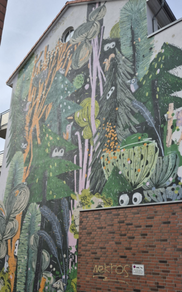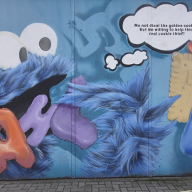 Bei der Suche nach den Graffitis stolpert man ganz nebenbei auch über das Krümelmonster am Hoftor der Firma Bahlsen – ziemlich witzig!