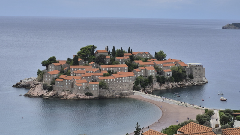 Kurz vor Budva haben wir dann noch einen kurzen Fotostopp eingelegt – den wohl fast alle Montenegro-Urlauber machen: der Blick auf Sveti Stefan. Die kleine Insel mit ihren historischen Steinhäusern war früher ein Fischerdorf und ist später in ein exklusives Luxusresort umgewandelt worden. Zutritt ist nur für Hotelgäste möglich – oder besser gesagt: war. Denn das Hotel ist seit einigen Jahren geschlossen und derzeit nicht in Betrieb. Trotzdem ist der Blick vom Aussichtspunkt oberhalb der Küstenstraße noch immer beeindruckend – fast schon ein Pflichtmotiv für die Kamera.