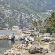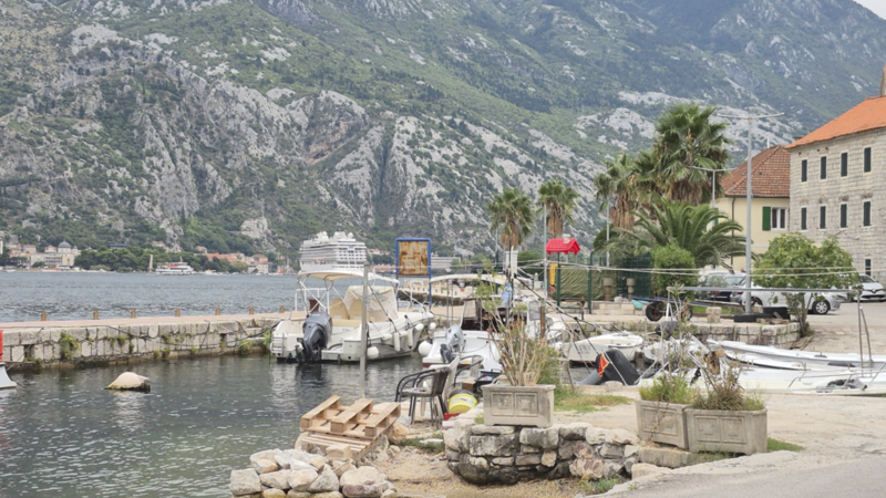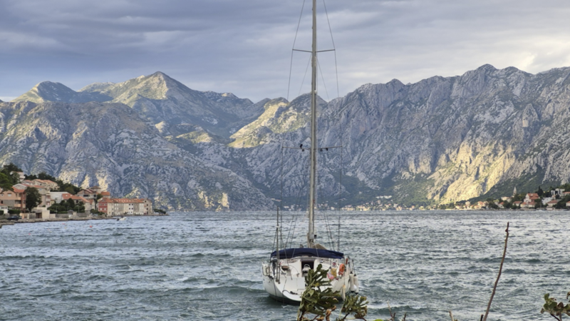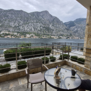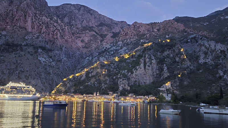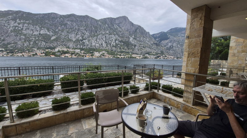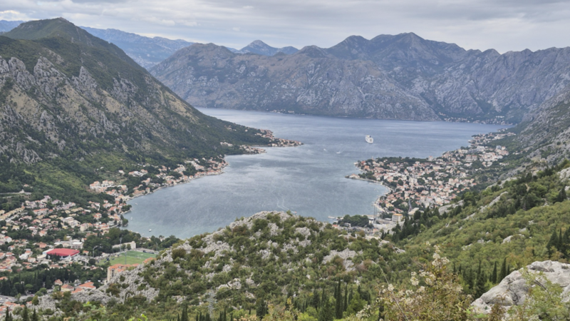 Wir waren nicht direkt in Kotor untergebracht, sondern im kleinen Ort Muo – direkt gegenüber der Altstadt, auf der anderen Seite der Bucht. Von dort hatten wir einen richtig schönen Blick auf den Fjord, die vorbeifahrenden Schiffe und die Berge im Hintergrund.