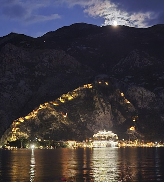 Aber dieser Abend in Kotor war einfach magisch: das warme Licht auf den alten Mauern, die Stadt in sanftem Glanz – und dann kam auch noch der Vollmond hinter dem Berg hervor. Dieses Bild von der beleuchteten Stadtmauer werde ich wohl nie vergessen. Was für ein wunderschöner Abschluss unseres Aufenthalts in Kotor!