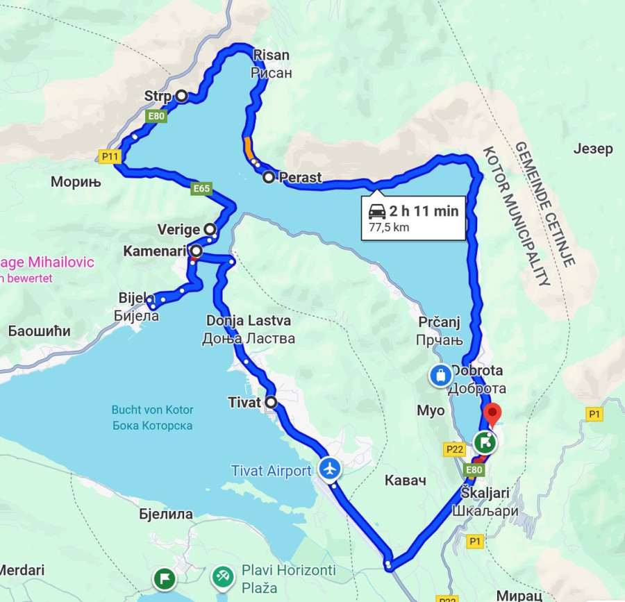 Auf einem unserer Fotos sieht man übrigens ganz gut die Start- bzw. Landebahn des Flughafens von Tivat, die sich direkt am Meer entlangzieht. Schon verrückt, wenn man bedenkt, dass die Flugzeuge dort praktisch direkt über dem Wasser starten und landen – sicher nichts für schwache Nerven, aber definitiv ein spannender Anblick!